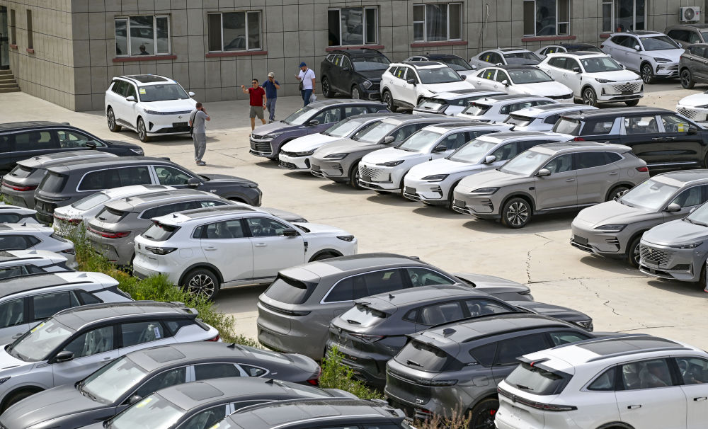 正在新疆霍尔果斯一家汽车商业公司,外国客商正在室外仓库领会环境(6月10日摄)。记者 陈朔 摄!