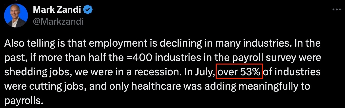 美国穆迪阐发公司首席经济学家马克·赞迪日前正在社交上发文,受关税导致的成本添加影响,美国跨越对折行业已从7月起头裁人。