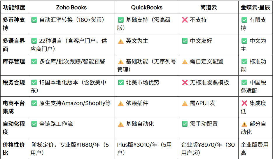 对比可见,Zoho Books正在全球化能力、从动化程度及性价例如面劣势凸起,特别适合同时笼盖多个国际市场、需要深度库存办理的中小外贸企业。外贸企业常面对欧盟VAT、中东电子、美国发卖税等复杂律例。若软件缺乏当地化适配,可能激发税务惩罚。的系统。例如Zoho Books具有15个当地化版本(含美国、英国、沙特等),可从动生成合适本地要求的税务申报文件,并支撑沙特电子等特殊格局。
