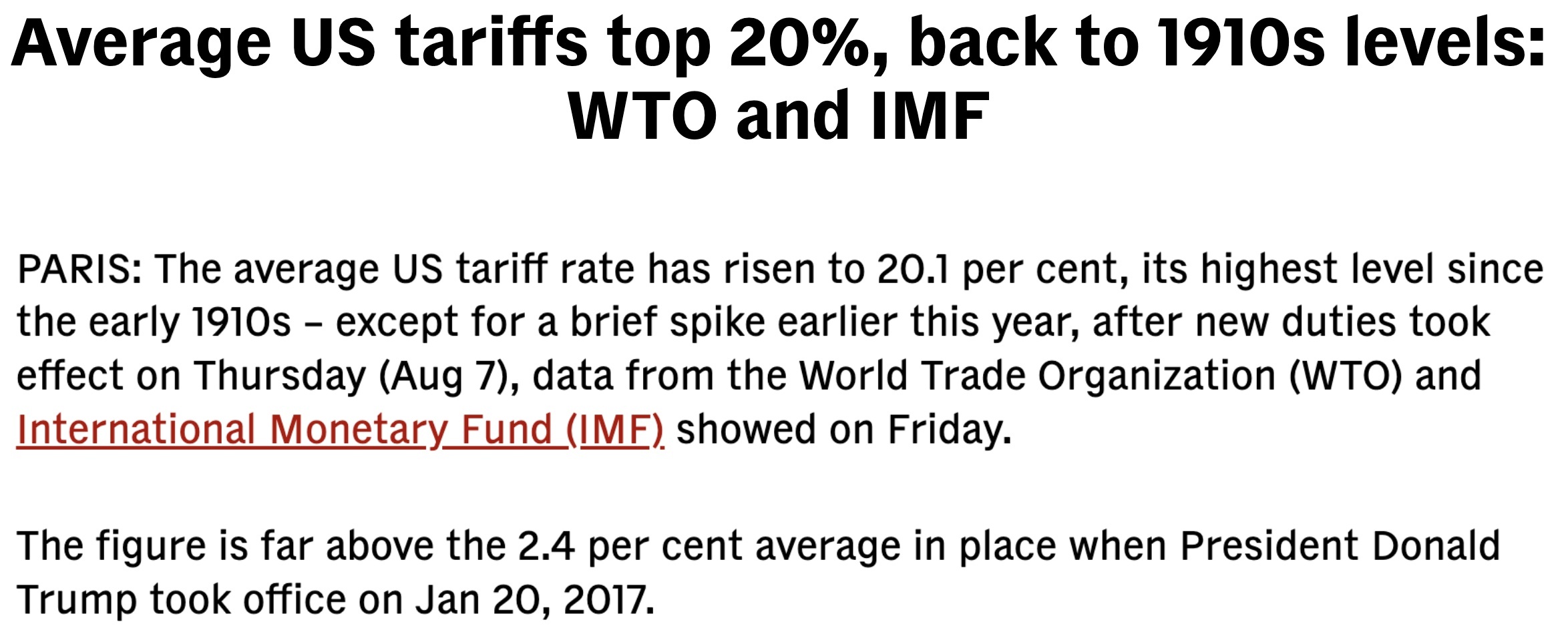 世界商业组织(WTO)和国际货泉基金组织(IMF)8日发布的数据显示,跟着新关税的实施,美国对全球所有产物的商业加权平均关税税率已达20。1%,大幅高于岁首年月本届美国上台前的2。4%,为110多年来的最高程度。