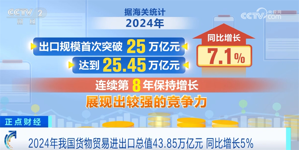 据海关统计,2024年,我国货色商业进出口总值43。85万亿元,同比增加5%。此中,出口规模初次冲破25万亿元,达到25。45万亿元,同比增加7。1%,持续第8年连结增加,进口18。39万亿元,增加2。3%。
