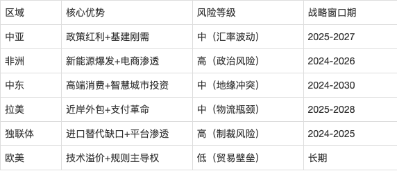 · 焦点驱动力:“一带一”深化,中吉乌铁、中哈产能合做项目加快落地,鞭策基建投资增加(乌兹别克斯坦2024年基建投资占P比沉达35%)。农业现代化需求火急,乌兹别克斯坦农机进口缺口超10亿美元,中国农机企业可结合中亚当地代办署理商(如Uzagrotech)成立拆卸厂,降低关税成本。· 计谋:优先结构建材(哈萨克斯坦建材进口额年增18%)、农业机械(补助政策笼盖30%采购成本),操纵新疆自贸试验区“跨境易货”模式冲破外汇管制。· 市场潜力:非洲家庭光伏系统渗入率不脚5%,但年增速超40%(尼日利亚、肯尼亚需求最旺);电动车市场受政策驱动(如南非打算2035年禁售燃油车),锂电池进口需求激增,中国磷酸铁锂电池成本劣势显著(较日韩低15%)。· 当地化径:借力Jumia等平台“最初一公里”配送收集,结合当地经销商(如SolarNow)供给分期付款办事;正在摩洛哥、规避非洲自贸区(AfCFTA)原产地法则。· 需求升级:沙特“2030愿景”鞭策高端建材进口(2024年智能家居市场规模达67亿美元),阿联酋迪拜世博会后续效应带动贸易地产投资增加12%。中国智能家居品牌(如小米、华为)可通过Noon平台“品牌旗舰店+当地仓”模式缩短交付周期至3天。· 风险对冲:关心地缘波动(如红海航运风险),正在阿曼杜库姆财产园成立区域分拨核心,分离供应链风险。· 冲破点:巴西“再工业化”打算催朝气床、从动化设备需求(2024年进口额增加22%),墨西哥衔接近岸外包,汽车零部件对美出口激增35%。中国三一沉工、徐工机械可通过墨西哥曼萨尼约港转口,规避美国“原产地法则”审查。· 当地化环节:接入巴西Pix立即领取系统(笼盖70%生齿),取Loggi、99Minutos合做提拔物流时效(墨西哥城48小时达笼盖率从45%提至75%)。· 机遇窗口:制裁下,俄罗斯汽配进口缺口达120亿美元,中国二手电子产物(如华强北翻新手机)通过Ozon平台市占率从8%跃升至32%。白俄罗斯、哈萨克斯坦成为“平行进口”曲达枢纽,可设立保税仓规避制裁风险。· 合规策略:采用“灰色清关+当地分销商”模式(如取俄罗斯SPSR Express合做),避免间接对俄出口触发次级制裁。· 高附加值赛道:欧盟碳关税倒逼低碳手艺出口(如中国氢能炼钢设备成本较欧洲低40%),美国《通缩削减法案》补助新能源需求,比亚迪储能系统通过墨西哥拆卸获美国补助资历。· 医疗设备:取本地医疗机构(如美国HCA Healthcare)签定持久维保和谈,绑定耗材发卖;